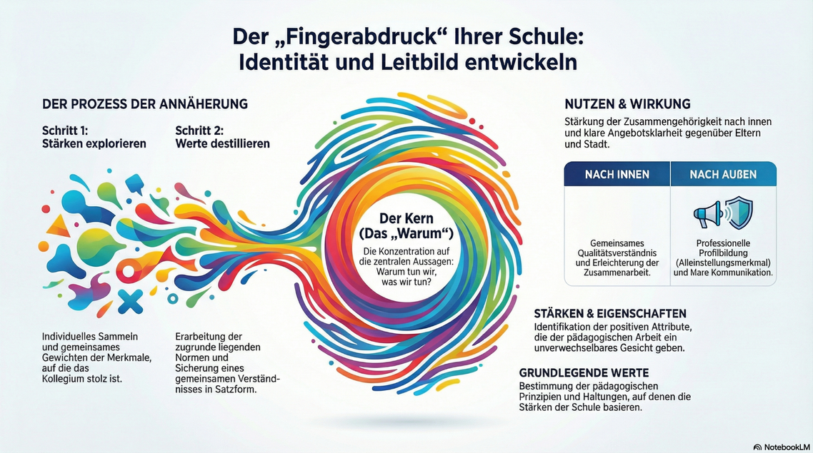 Wenn Schulen ihr Leitbild weiterentwickeln oder neu denken möchten, stehen sie heute vor veränderten Herausforderungen und Möglichkeiten. In dieser Episode sprechen fünf Trainerinnen und Trainer der staatlichen Schulentwicklungsberatung NRW über innovative Zugänge zur Leitbildarbeit. Mit dem „Fingerprintverfahren“ und dem „Sprung in den Zukunftsraum“ stellen sie zwei Methoden vor, die Beteiligung neu gestalten und den gemeinsamen pädagogischen Diskurs vertiefen. Die Folge knüpft an die frühere Episode „Leitbild“ an und erweitert die Perspektive auf eine zeitgemäße, zukunftsorientierte Schulentwicklung.